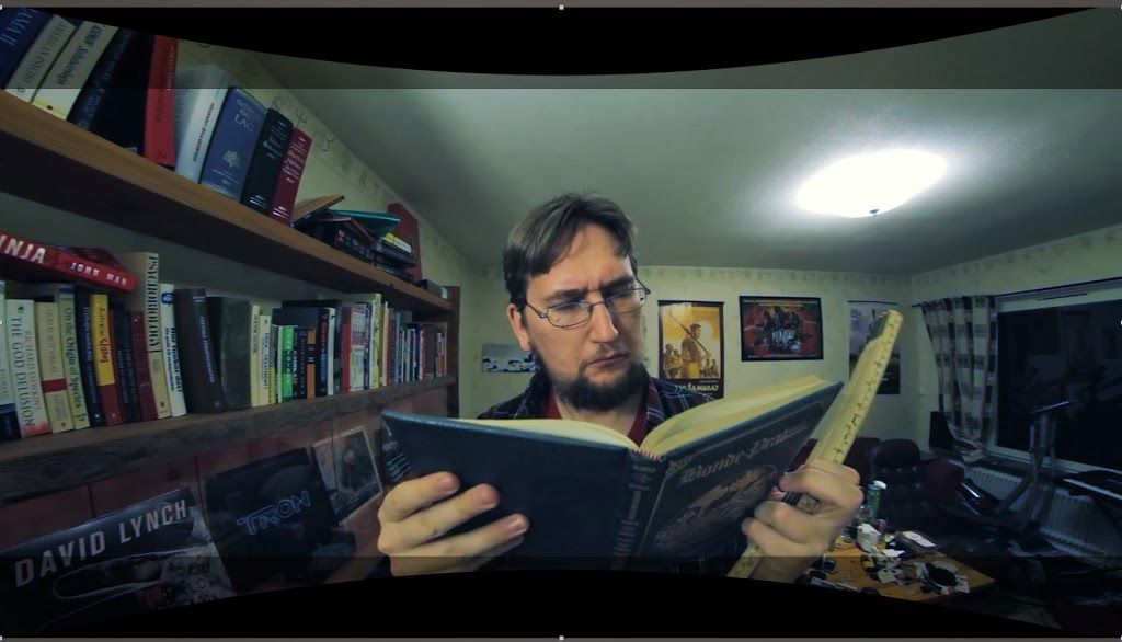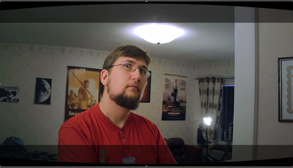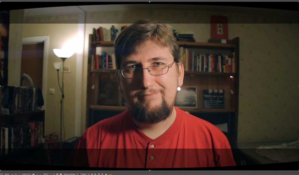 And this involved first stretching the image horizontally to twice its width. Then applying a reversed Optics Compensation filter set to a number that looked sort of right. And then squeezing the result back to the correct ratio and finally scaling it back down until it became smile-boxed almost to the point of creeping into the image. And then cropping the result.