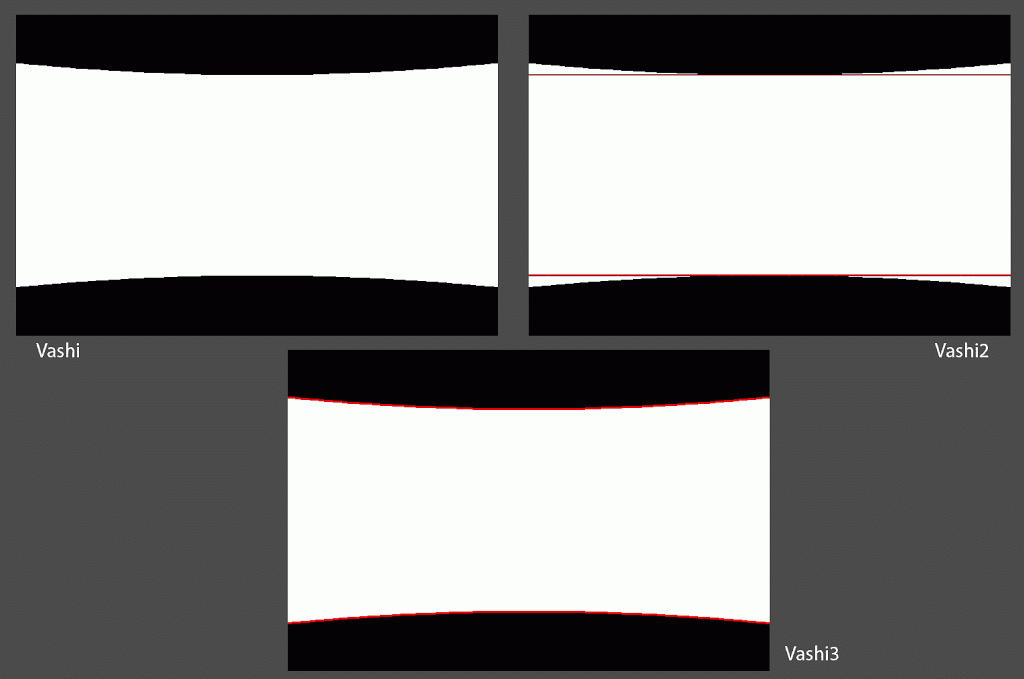 They all only show pixels that will be included in a straight application of VashiMorphic distortion. The first one, simply named Vashi, is just a simple letterbox without anything else. Some people prefer those. I, however, quickly experienced issues with these simplistic ones because in dark scenes it’s hard to determine where the cropmark ends and the scene begins. So I have taken up a tradition of outlining my cropmarks with a red line. It works better for me, but I included both versions. Vashi2 is a hybrid of a simple crop and the smile-box preview of what will be included if its VashiMorphized. Vashi3 is my preferred version with the aforementioned red outline.